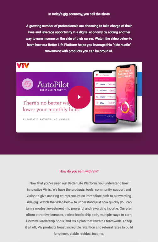 Share this page with anyone who is interested in becoming a Viv Life Consultant or wants to learn more about Viv’s compensation plan. In the business overview webinar, your prospects will hear and see compelling reasons from our CSO Robert A. McFadden why starting a side hustle with Viv today is a smart choice. The compensation plan summary video helps to explain simply how the Viv model rewards you for selling products and services that people want and use every day.